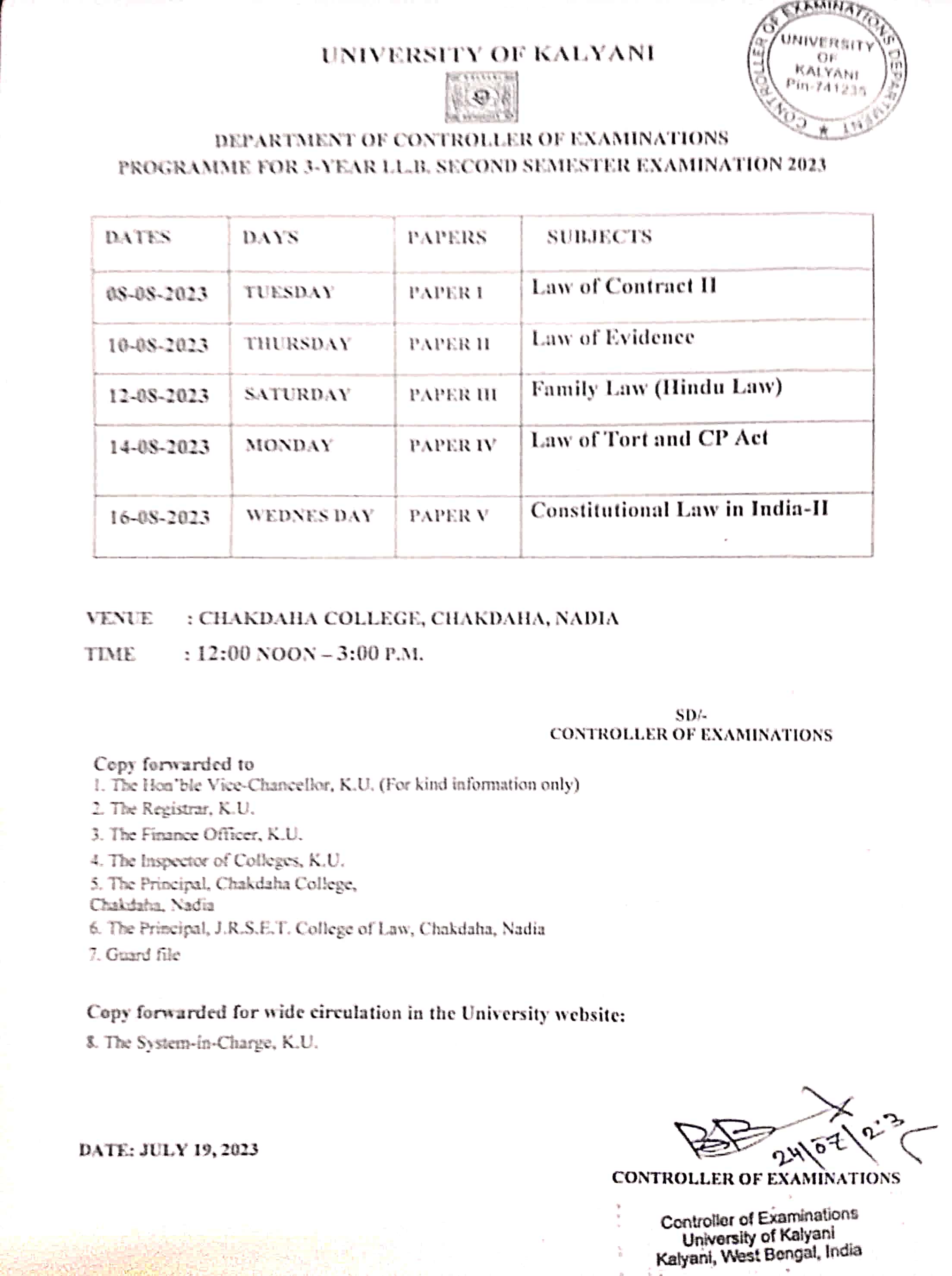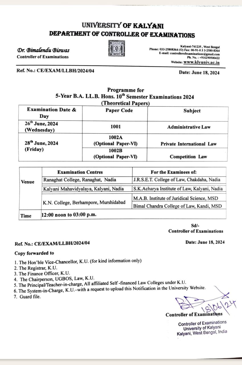 Kalyani University Examination programme for 3-year LLB second semester routine,2023